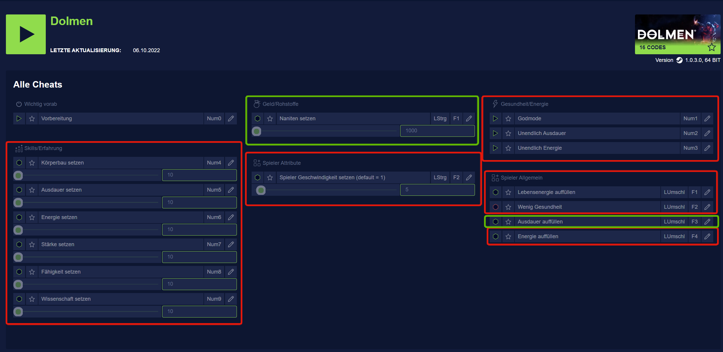 Ich habe bei Dolmen ein Problem, dass die meisten Cheats nicht funktionieren, einzig mit den Naniten funktioniert.